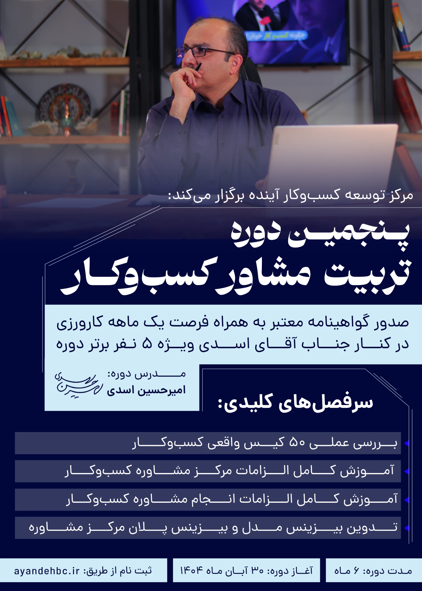 برای ثبت نام در پنجمین دوره تربیت مشاور کسب و کار، به روی لینک کلیک کنید.