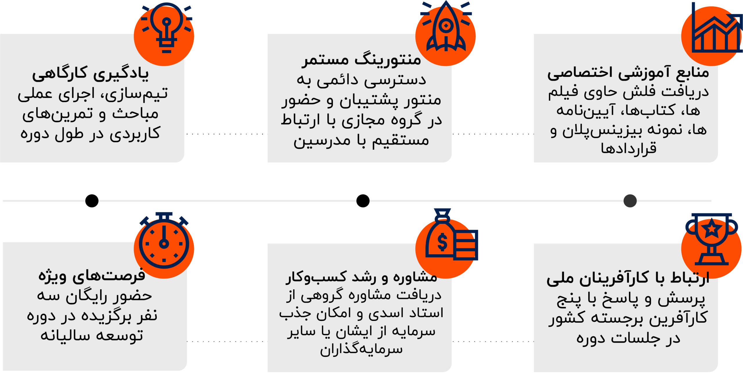 ۲۴ جلسه منتورینگ فردی: شش ماه، هر هفته یـک جلسه اختـصاصی یک ساعته با منتـور شخصی خود جهت پیگیری و اجرا